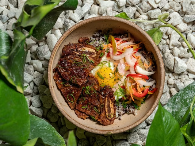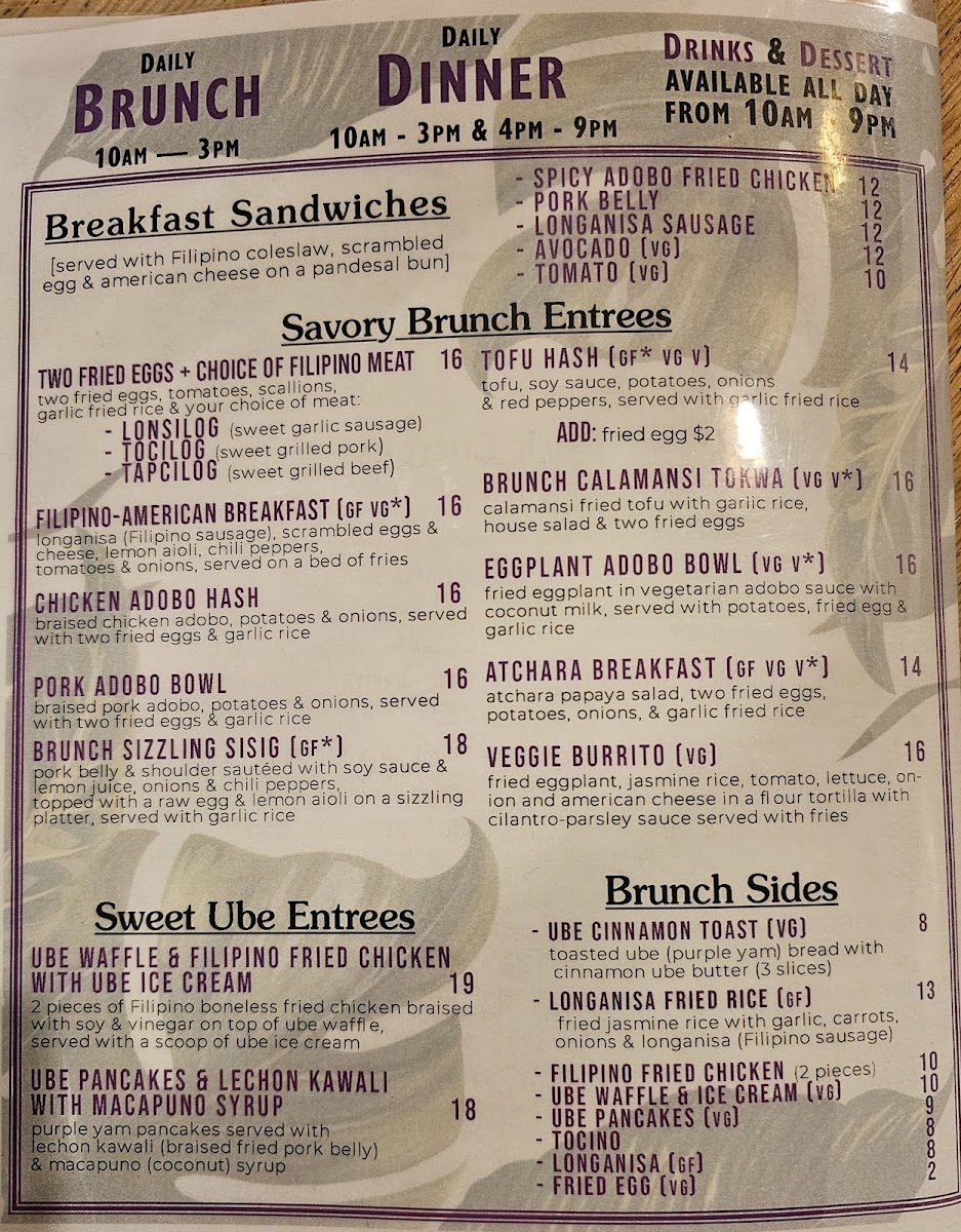 Start your brunch experience with the classic Itlog, a simple yet satisfying dish composed of fried eggs and garlic rice for only $14.00. For those craving something heartier, the Tocilog, with sweet grilled pork paired with eggs and a heaping portion of garlic fried rice, is a must-try at $21.00. Another popular choice is the Tofu & Bell Pepper Bowl, which combines flavor-packed tofu with fried potatoes and bright bell peppers, served alongside a hearty portion of garlic rice, all for $19.00.