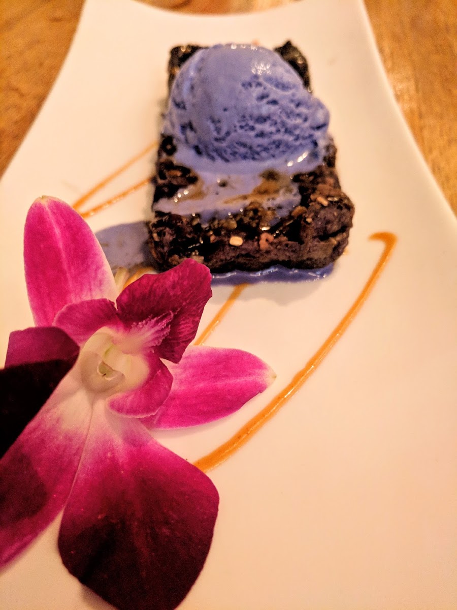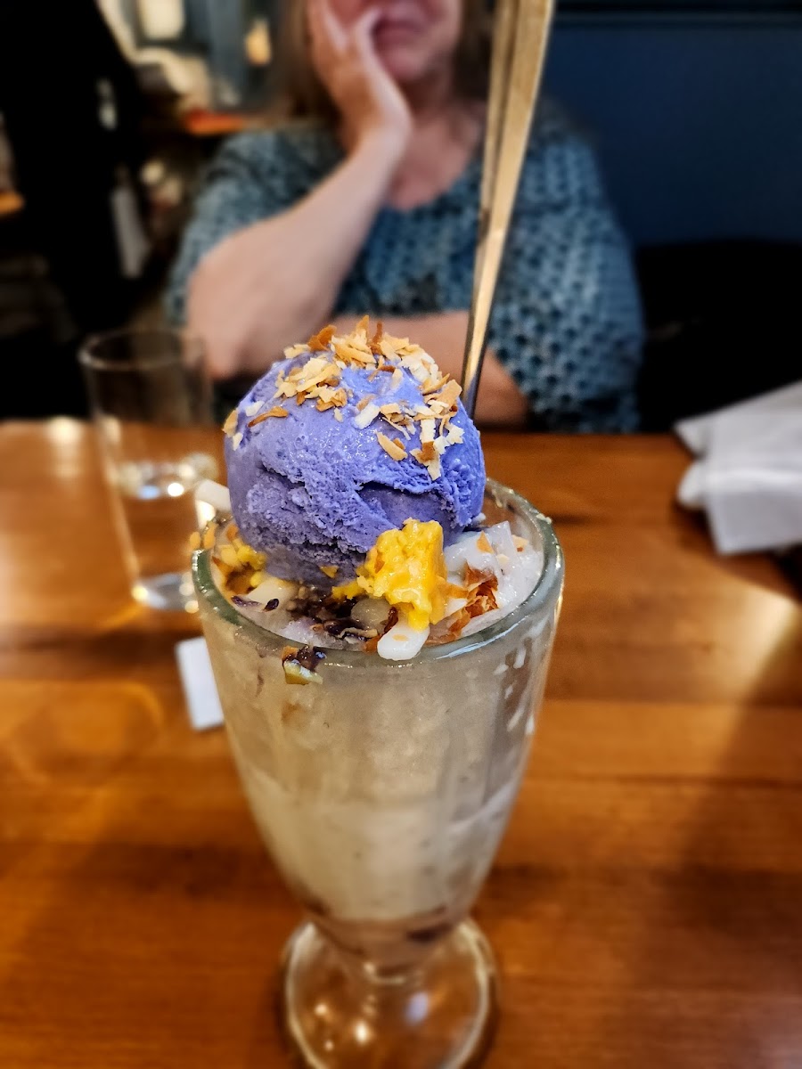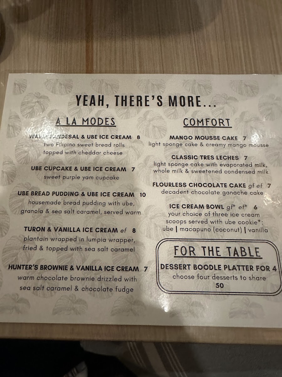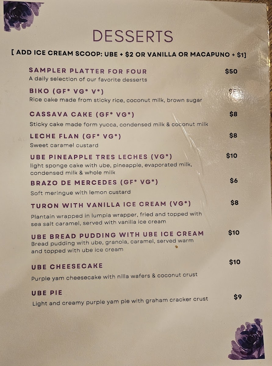 Lovely experience, from the quick service to the delectable food, I will be thinking about this meal. We got the spicy chicken wings, the something sweet mocktail to start which were both delicious, the chicken was juicy and full of flavor and came very fast. I got the spicy adobo fried chicken entree and my friend got the ginger pork belly pancit which did not disappoint and came in large portion sizes, we both ended up with leftovers. Finally we had to try the ube bread pudding with ube ice cream and not a crumb was left. Absolutely amazing meal and would definitely recommend to anyone in the area. Just make sure to make a reservation beforehand.