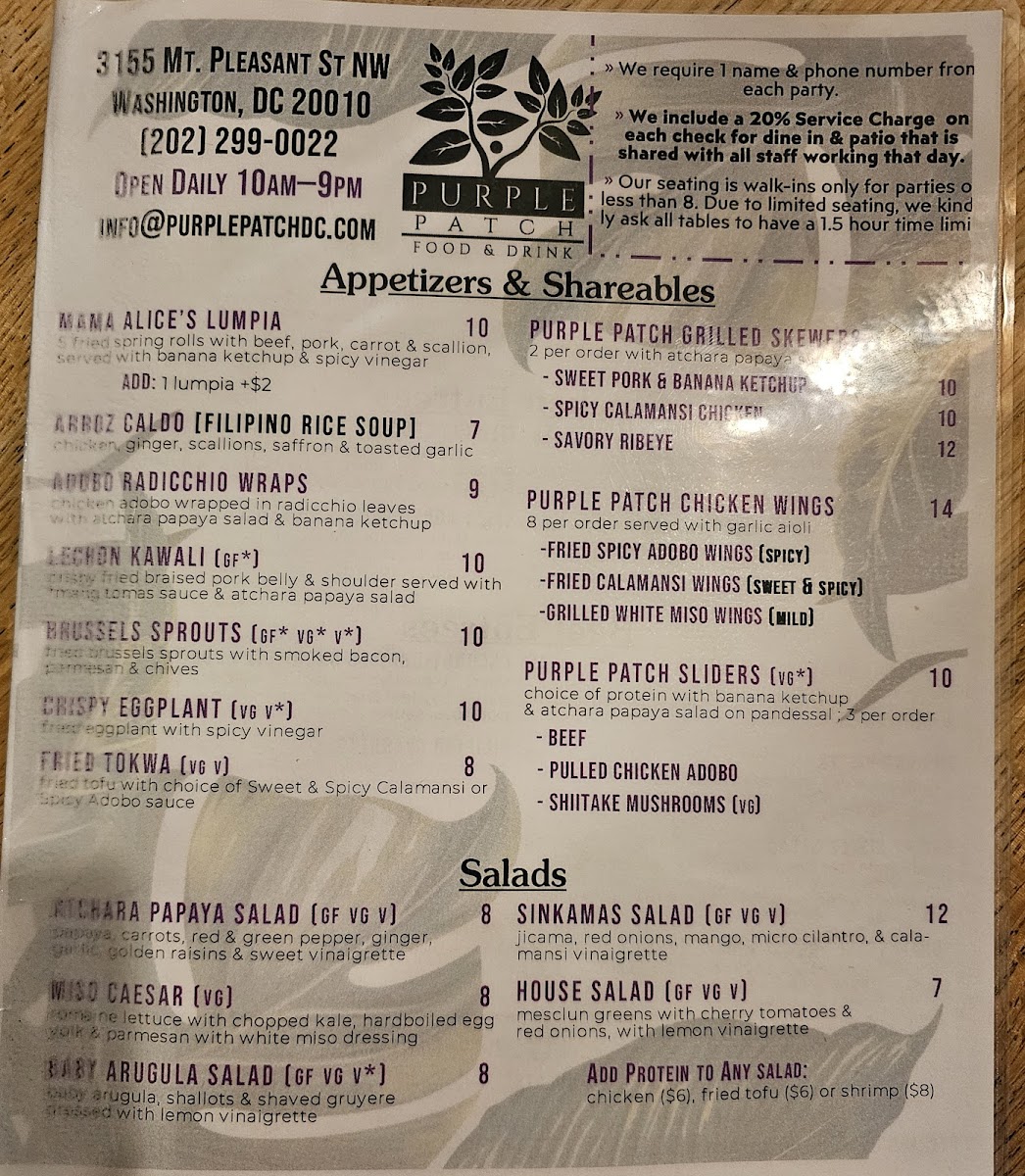 If you’re looking to experience the rich flavors of Filipino cuisine in the heart of Washington, D.C., look no further than Purple Patch, a charming and intimate restaurant located at 3155 Mt Pleasant St NW. This gem brings the vibrant heart of Filipino culture to the forefront, enchanting guests with both the authenticity of its dishes and the warmth of its atmosphere.